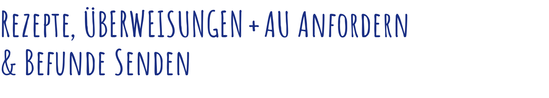 Hier können Sie für Ihr Kind vorab ein Rezept für Medikamente (auch eRezepte), Ergotherapie, Physiotherapie und Logopädie, eine Überweisung (ÜW) sowie eine AU für Ihr Kind bis maximal 3 Tage bestellen. Die Bearbeitungszeit beträgt max. 2 Werktage und das Formular liegt dann am Empfang für Sie bereit. Halten Sie bei Abholung weiterhin die Chipkarte Ihres Kindes bereit.